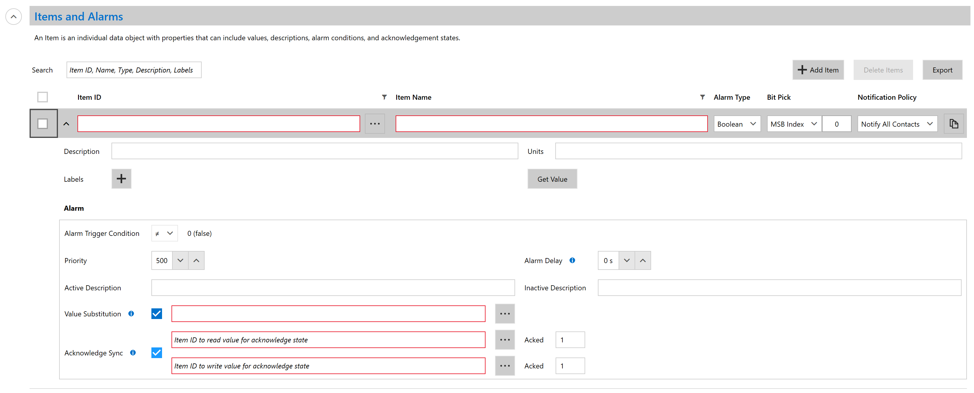 Acknowledgment Sync: This allows you to sync the ack state with a SCADA system by writing to and monitoring ack tags. (Boolean alarms only)